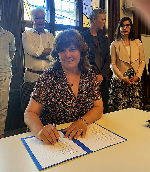 Bild: Gudula Lühle, Geschäftsführerin der WIB – Weißenseer Integrationsbetriebe GmbH unterschreibt den Kooperationsvertrag. Hintere Reihe von re: Anne Jeglinski, stellvertretende Geschäftsführerin des Deutschen Paritätischen Wohlfahrtsverbandes Landesverband Berlin e. V, Dr. Cordelia Koch, Bezirksbürgermeisterin von Pankow und Prof. Dr. Bernd Halfar, Kamel & Nadelöhr GmbH